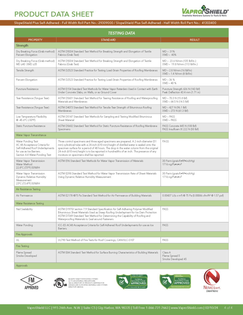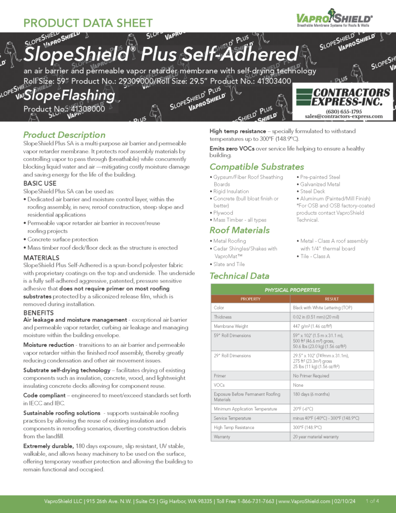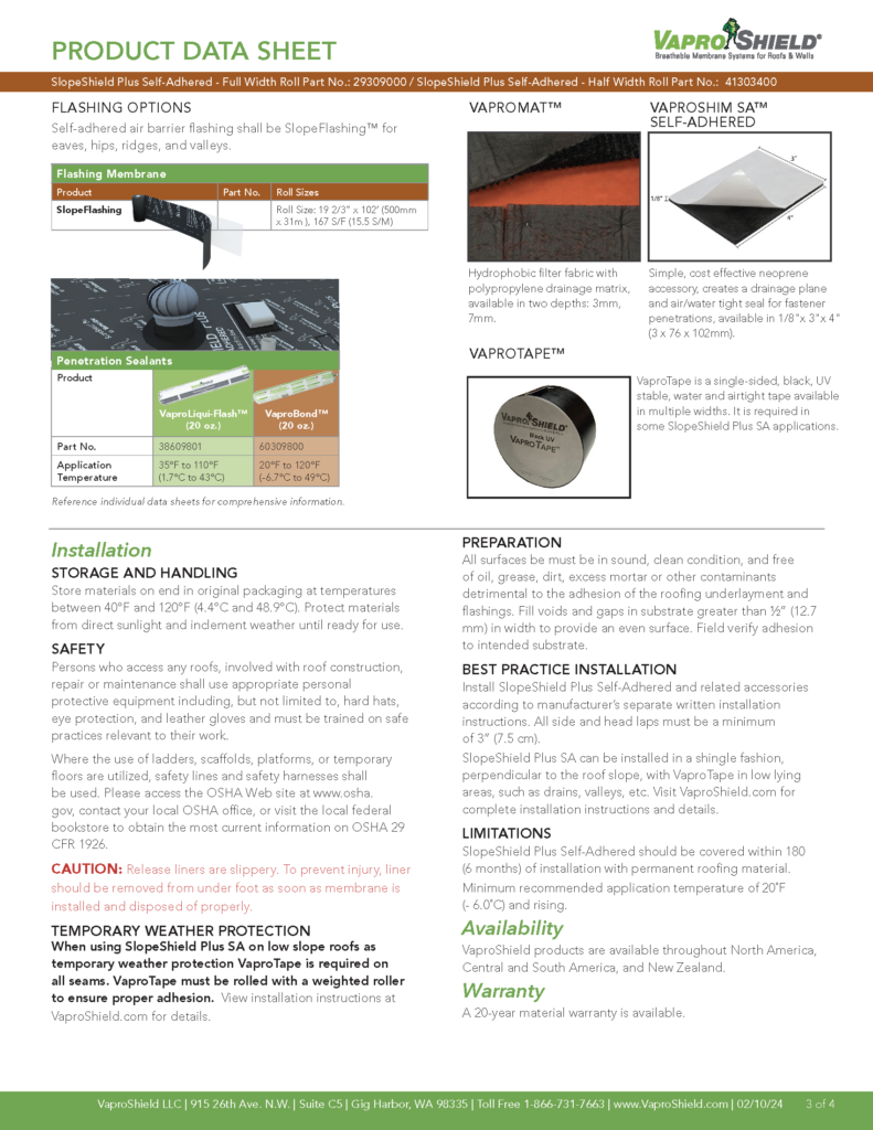 SlopeShield™ by VaproShield® is a factory-applied, vapor-permeable roof cover board with an integrated water-resistive barrier. It combines slope correction and moisture management in a single system, helping to direct water to drains while providing a continuous, sealed protection layer beneath the roofing assembly. SlopeShield reduces installation time, enhances roof performance, and supports long-term building protection.
